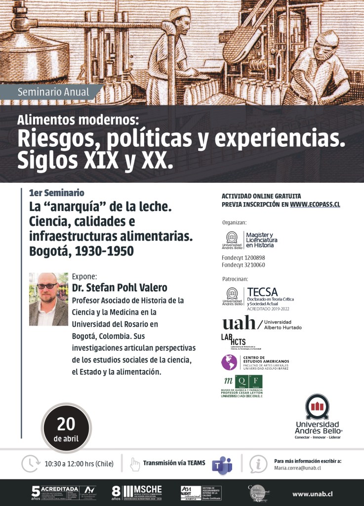 A lo largo de la primera mitad del siglo XX, el discurso alimentario experto consolidó la idea de que el consumo de leche de vaca era un indicador de civilización y progreso y una estrategia central para lidiar con los problemas nutricionales. No obstante, en el contexto urbano de Bogotá, todavía en la década de 1950 se le denominaba el “veneno blanco”, en tanto que seguía siendo considerada como vector importante de enfermedades infecciosas y causa principal de la mortalidad infantil. En torno a los intentos locales por definir, medir y regular la “calidad” de la leche (entre 1930 y 1950), en esta ponencia quiero abordar el sistema lechero – desde el hato hasta el vaso– como como un ensamblaje de diversos conocimientos expertos, instituciones, funcionarios, infraestructuras, medidas administrativas, prescripciones morales e intereses materiales, cuya articulación y estabilidad fue precaria y caracterizada por generar una “anarquía entre productores, distribuidores y autoridades”.