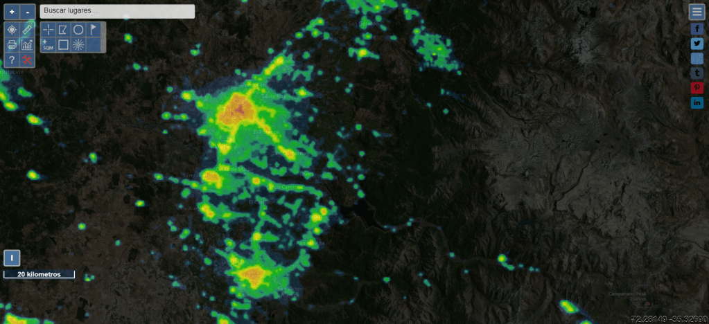 Fig.3 Mapa de contaminación lumínica del Maule sur, en base a imágenes satelitales de la tierra. Fuente: Espacio de descargas en https://www.lightpollutionmap.info/