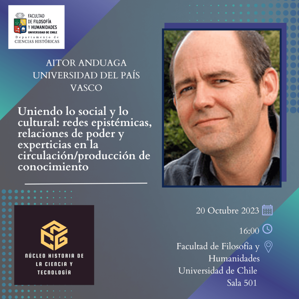 Finalizamos con el viernes 20 de octubre a las 16:00 hrs.en la Facultad de Filosofía y Humanidades, Universidad de Chile, Campus Juan Gómez Millas de Ñuñoa., sala 501, con la charla de Aitor Anduaga «Uniendo lo social y lo cultural: Redes epistémicas, relaciones de poder y experticias en la circulación/producción de conocimiento”. La idea es discutir más allá de temas específicos sobre los alcances de la noción red y la producción social del saber científico.