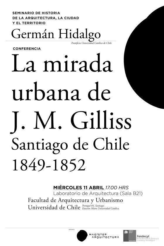 «La mirada urbana de J. M. Gilliss. Santiago de Chile, 1849-1852», miércoles 11 de abril a las 17 hrs., sala B-21, Portugal 84, Santiago. Dr. Germán Hidalgo.