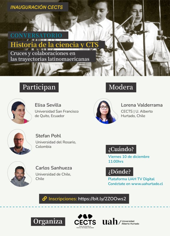 Inauguración CETS-UAH, Viernes 10 de diciembre a las 11 am (hora Chile continental): Cruces y colaboraciones de la historia de la ciencia y CTS en Latinoamérica. Online con inscripción previa.