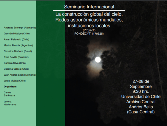 Seminario Internacional La construcción global del cielo. Redes astronómicas mundiales, instituciones locales. (The global construction of the Heavens. Worldwide astronomical networks, local institutions) Santiago de Chile Universidad de Chile (Archivo Andrés Bello, Casa Central) 27-28 septiembre 2018